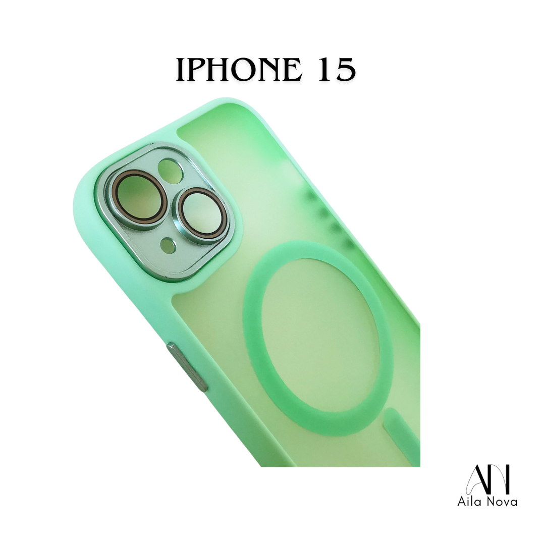 Protege tu iPhone 15 con esta funda MagSafe de acabado mate, diseño minimalista y protección antiimpactos. Disponible en verde pastel y negro translúcido. Elegante, resistente y 100% compatible con carga magnética.